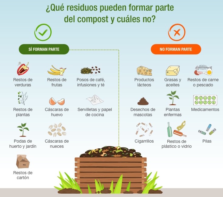 Junta en tu casa los desechos orgánicos en un recipiente o bolsa reutilizable que puedas mantener cerrada. Puedes traer: restos de frutas y verduras, cáscaras de huevo, restos de café y mate, entre otros. Revisa la siguiente foto para conocer qué puedes compostar. No lo mezcles con otros residuos plásticos, carnes, lácteos o residuos sanitarios.